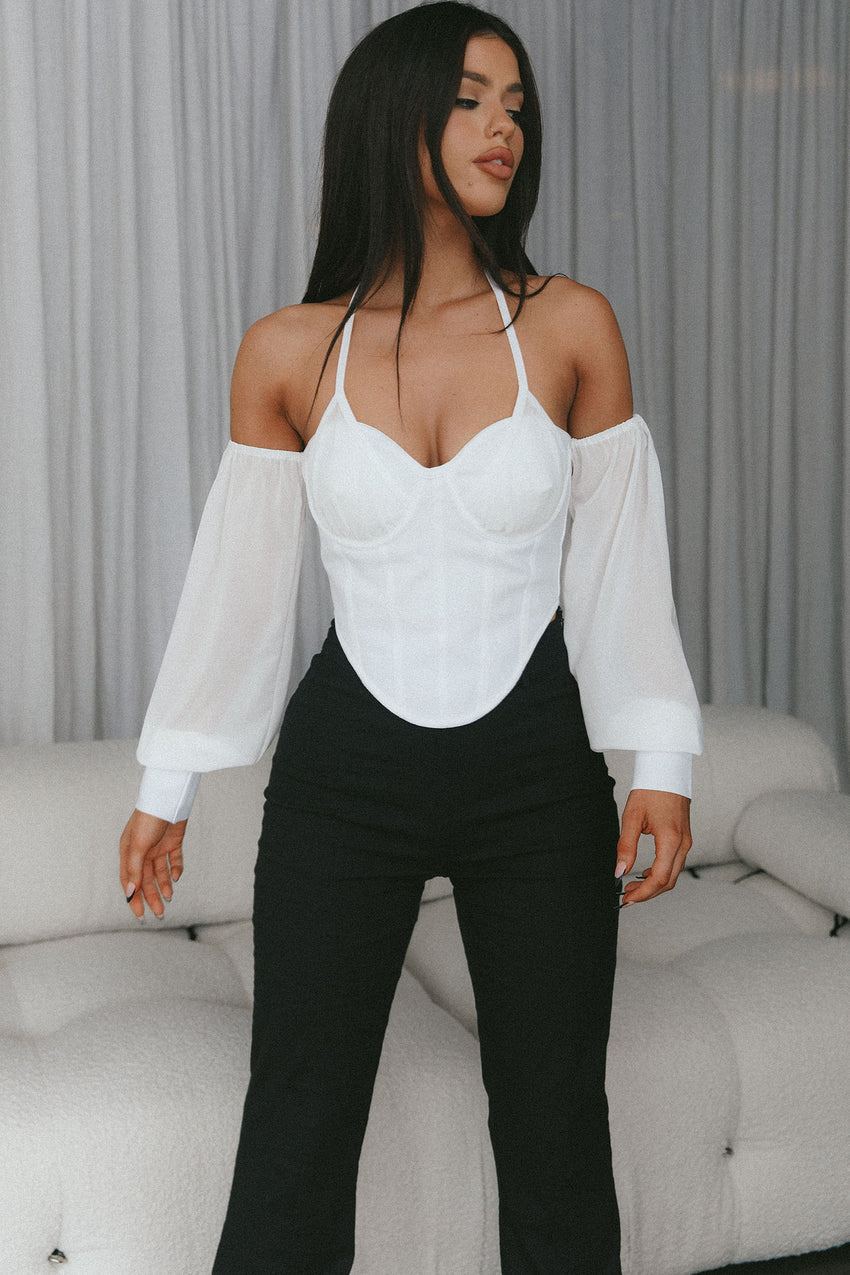 Make a statement in our hot Adonica top. We are loving the boning detail in the bodice and romantic, off-shoulder lantern sleeves. Perfect for a fun girls' night out! Team it with black jeans and heels for a chic look we are loving.